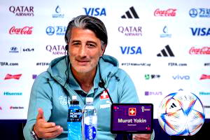 Switzerland’s coach Murat Yakin attends a press conference in Doha on December 5, 2022, on the eve of the Qatar 2022 World Cup Round of 16 football match between Portugal and Switzerland. (Photo by Fabrice COFFRINI / AFP)